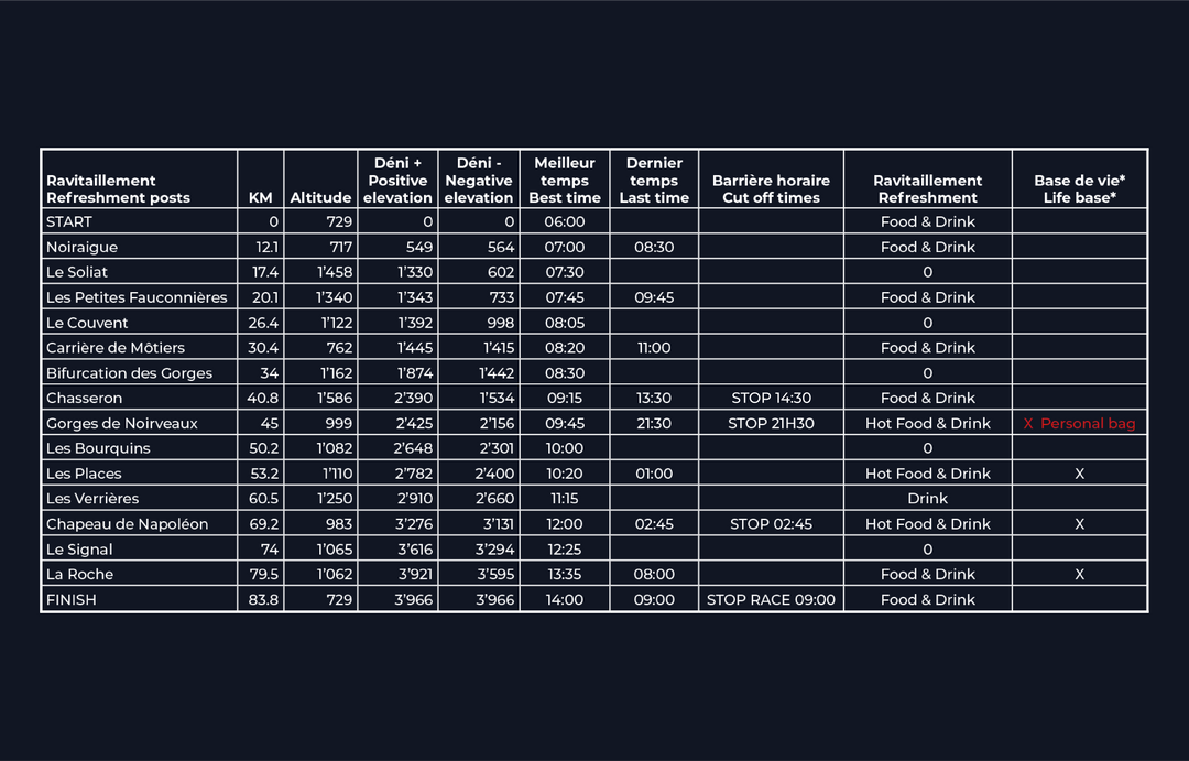 NB: Ravitaillements personnels possible à chaque poste officiel jusqu’à 100m après ceux ci. Ravitaillement sauvage = disqualification.